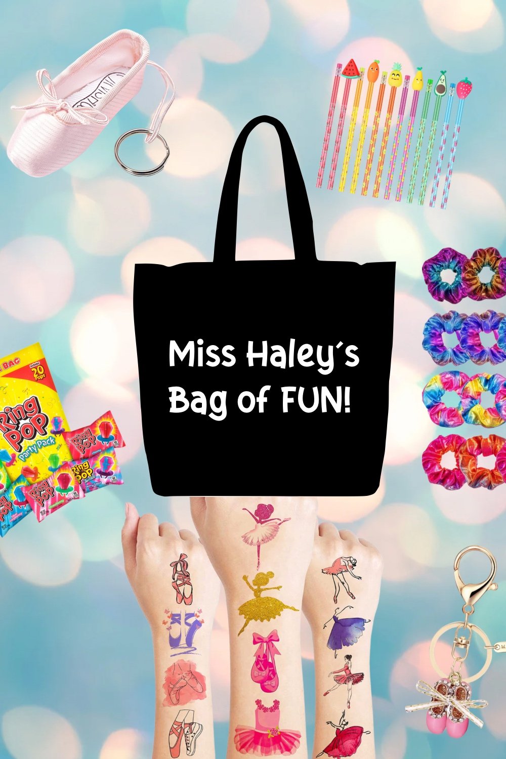 This is my favorite item on the list, but it isn’t brought out regularly. Miss Haley’s Bag of Fun is only used for special occasions when I need a little more power than just stickers. What is it you may ask! Grab a bag & start collecting random prizes such as; stickers, ring pops, tattoos, wands, magnets, headbands, bubbles, stamps, scrunchies, hair bows, stress balls, pencils, suckers, key chains, granola bars, sensory toys, you name it! Then you have your very own bag of fun. When a student answers a terminology question correctly or demonstrates a step properly, they close their eyes and reach into the bag! The last class before the recital or break, I let every student get a chance to pick something out of the bag!